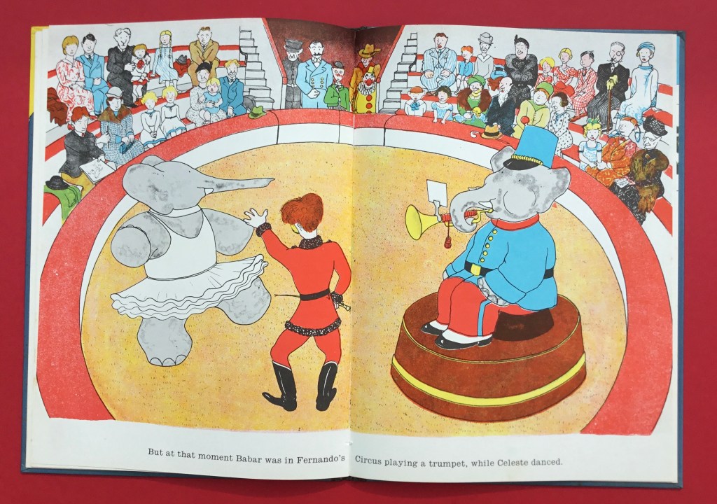 Babar’s Travels is a hugely confident book, the work of an author now so comfortable with the world he has created that there is space for himself within its pages. As Sendak observes. ‘He has even placed himself in the scene, the young man sitting in the audience pedantically measuring Celeste for a portrait with his outstretched thumb and pencil. The line of text below the picture (“Fernando took Babar and Celeste to his circus. He made Babar play a trumpet while Celeste danced! They were very unhappy”) is so simple that the art absolutely “blooms” above the words. One can hear Babar’s trumpet music.’