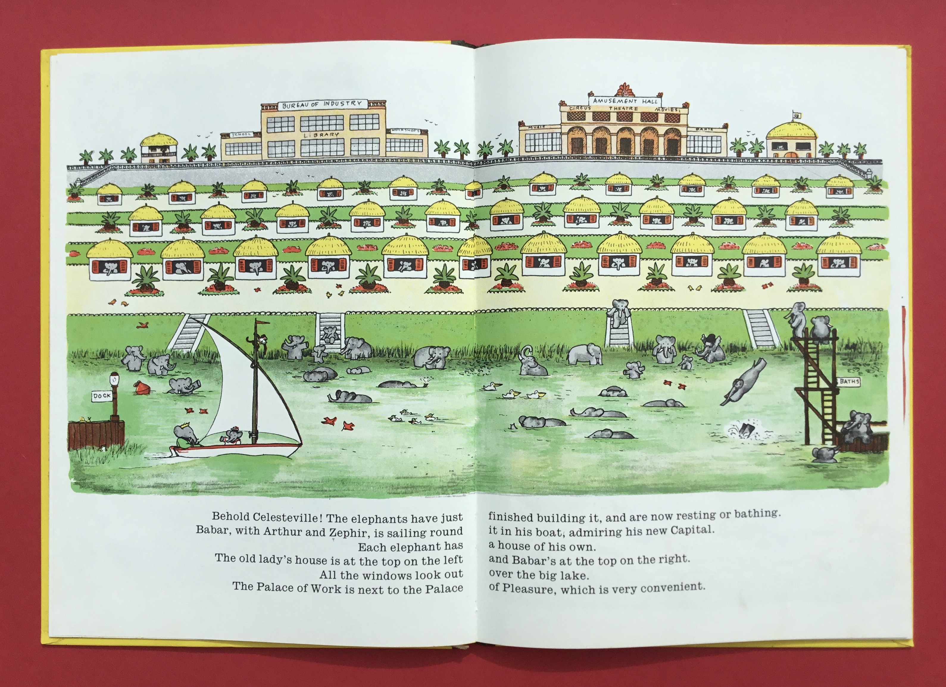 These scenes reflect Jean de Brunhoff’s own socialist beliefs. A supporter of the Front Populaire, his vision of Celesteville is what cultural historian Nicholas Fox Weber calls. ‘A feudal-like system (where) happy workers in identical houses thrive under the strong leadership of a single benevolent leader.’