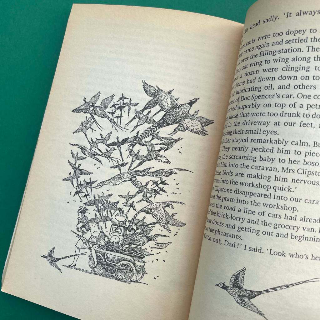 The book saw the return of artist Jill Bennett, who had previously been commissioned by Puffin editor Kaye Webb to provide illustrations for Fantastic Mr Fox. Quentin Blake aside, I think her work is the best match for Dahl’s stories. She captures the emotion of the story perfectly, but also its excitement and humour – specifically the moment where hundreds of drugged pheasants wake up and escape from a Silver Cross pram.